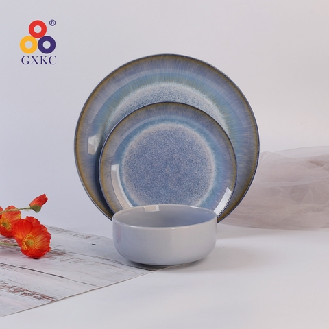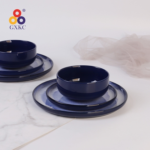 공장 직판 사파이어 블루 디지털 인쇄 컬러 유약 스트레이트 플랜지 석기 디너 플레이트 세라믹 식기 세트